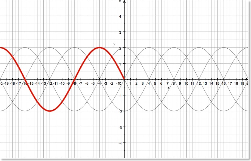 Die (rote) Welle ( Lambda: 16) steht zum Zeitpunkt t = 0 noch links von x = 0. Je nach verstrichener Zeit wandert sie entsprechend nach rechts,